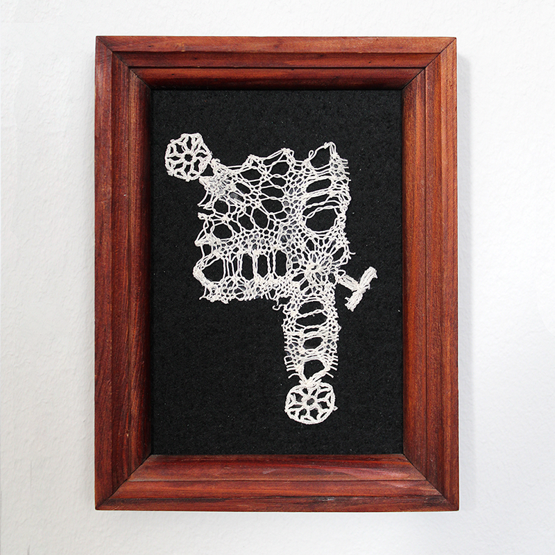 Кожная літара вырабленая з пажыўшых век карункавых сурвэтак і змешчаная ў абдымкі гэткай жа немаладой рамкі.